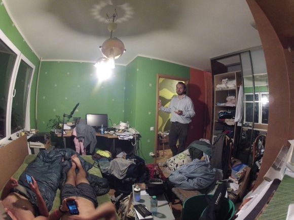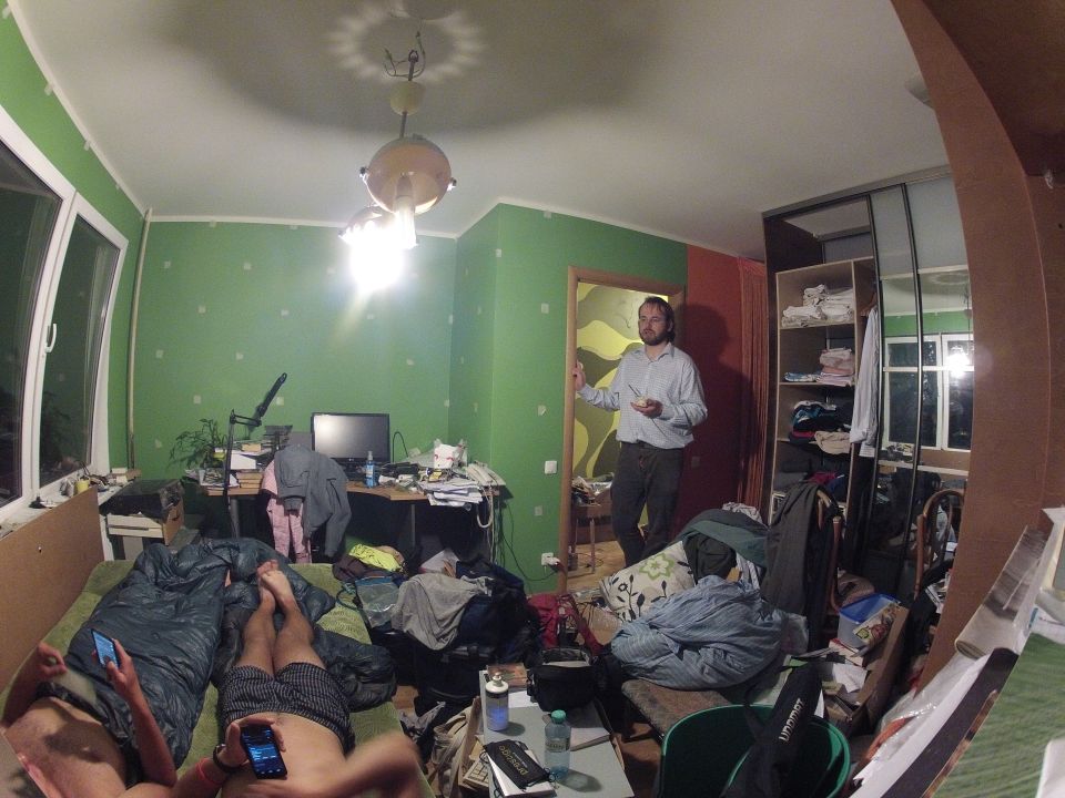 Zum Schluss unseres zweitägigen Aufenthaltes in Riga gönnten wir uns ein komplettes Servicepaket: Schwalbe-Ersatzpneu bis 6 Bar, Komplettreinigung, neue Kurbel rechts, Flaschenhalter für Moscht, neue Lenkergriffe und Schaltzüge, neuer Kettennieter, neue Pumpe, Essen für drei Tage (v.l.n.r.). Macht nach rigischer Rechnung alles zusammen 110 Franken. It’s quiet cheap, meint Oli dazu :)